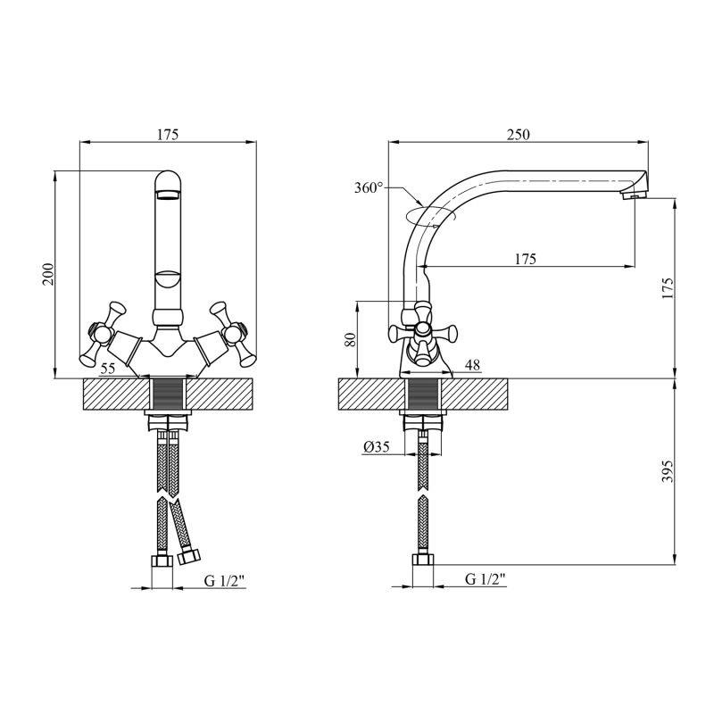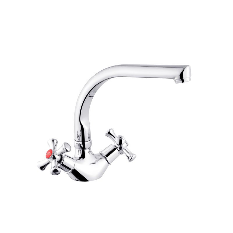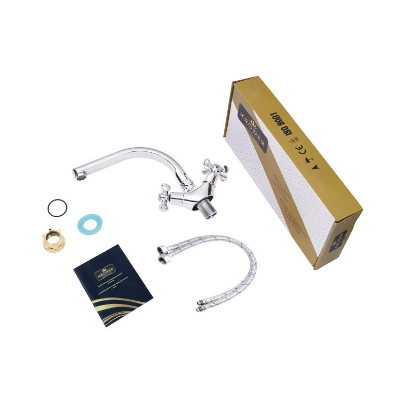 Змішувач для кухні Kroner KRM Rhein-C033 CV018075 виготовлений із силуміну та має хромоване покриття. У змішувача є поворотний високий вилив та класичні хрестоподібні ручки. Завдяки керамічним кран-буксам налаштування температури та напору води буде легким та швидким. Змішувач встановлюється на один отвір і підключається гнучкими шлангами, що входять до комплекту постачання.