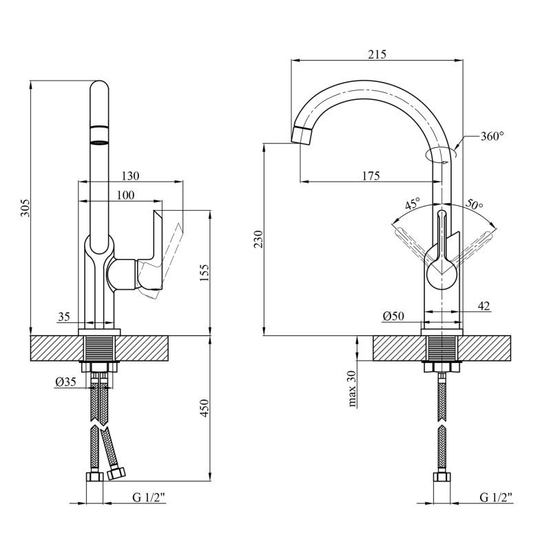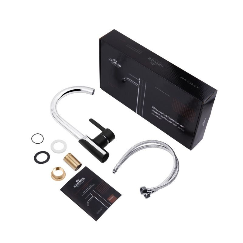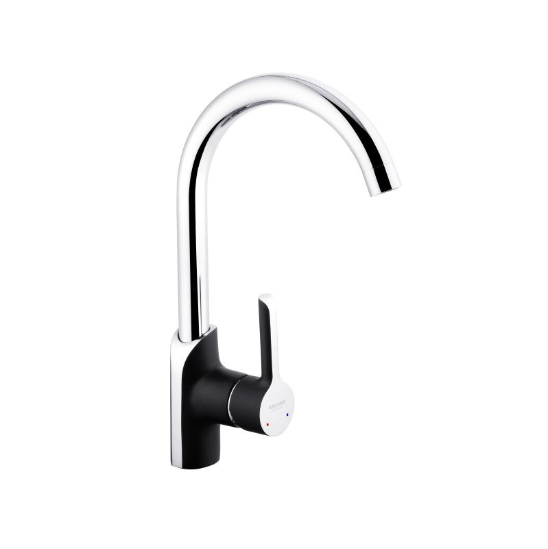Змішувач для мийки Kroner KRP Essen-SCH030 CV024333 виконаний з латуні та має гладку чорну поверхню корпуса та хромований вилив. Високий поворотний вилив змішувача дозволяє мити великогабаритний посуд, обробляти продукти та наповнювати високі вази водою з комфортом. Змішувач встановлюється на один отвір і підключається за допомогою шлангів, що входять до комплекту постачання. Оригінальна обтічна форма корпусу змішувача забезпечує стікання крапель і, як наслідок, менші зусилля з догляду та чищення.