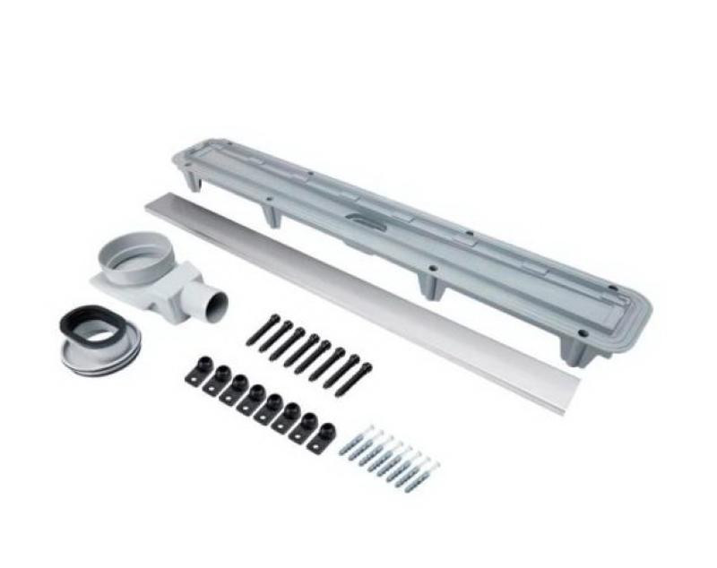 комплектація: душовий канал - 1 шт, сифон - 1 шт, ґрати для волосся 1 шт, універсальна двостороння накладка з нержавіючої сталі 1 шт, гідроізоляційні стрічки 4 шт, монтажний набір для кріплення регульованих ніжок: шуруп D 3,5x35мм - 8 шт. дюбель 6х35 мм - 8 шт, регульовані ніжки - 8 шт