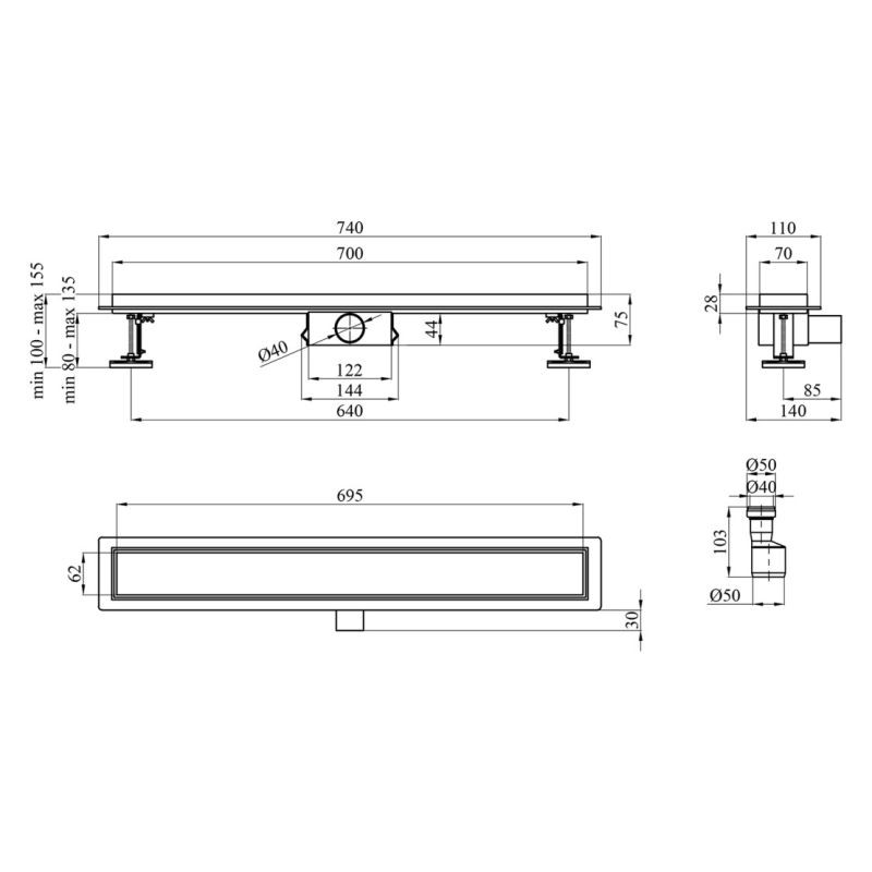 Габаритні розміри виробу (ШхГхВ), мм 740х140х(100-155)