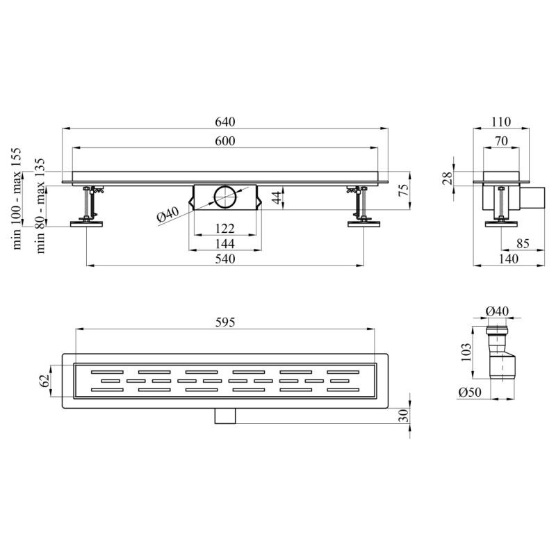 Габаритні розміри виробу (ШхГхВ), мм 640х140х(100-155)