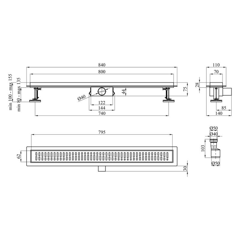 Габаритні розміри виробу (ШхГхВ), мм 840х140х(100-155)
