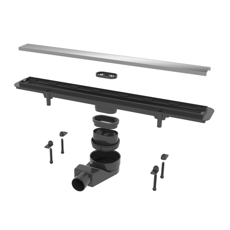 комплектація: душовий канал - 1 шт, сифон - 1 шт, решітка для волосся 1 шт, накладка з нержавіючої сталі 1 шт, гідроізоляційні стрічки 4 шт, монтажний набір для кріплення регульованих ніжок: шуруп D 3,5x35 мм - 4 шт., дюбель 6 х шт