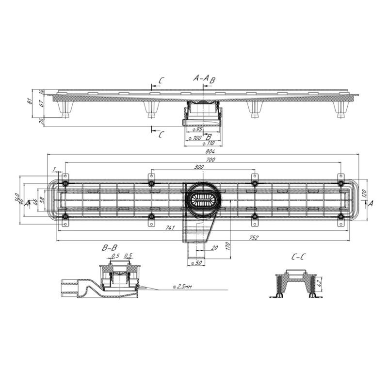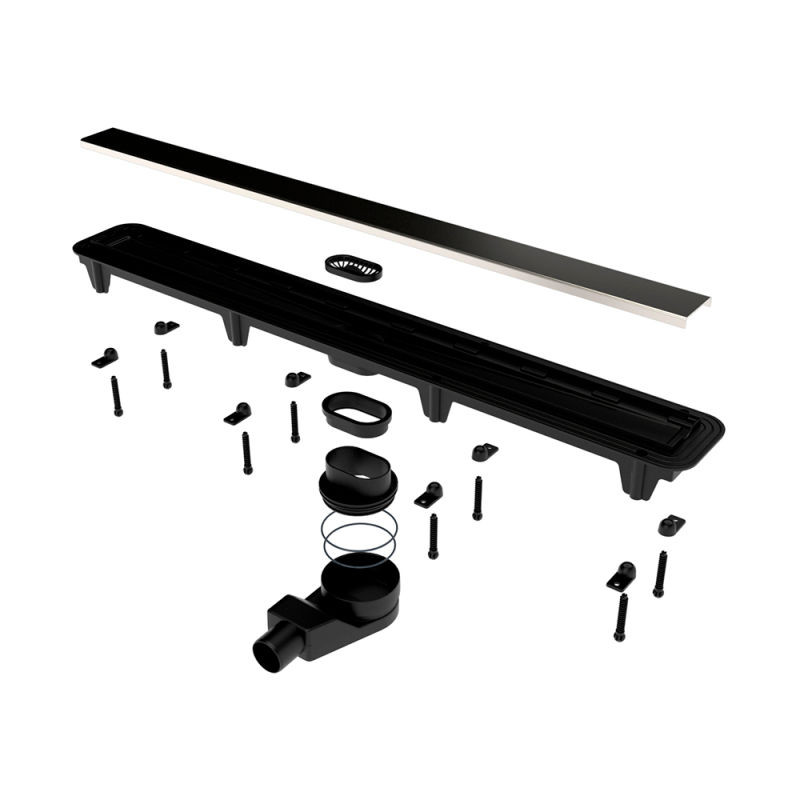 комплектація: душовий канал - 1 шт, сифон - 1 шт, решітка для волосся 1 шт, накладка з нержавіючої сталі 1 шт, гідроізоляційні стрічки 4 шт, монтажний набір для кріплення регульованих ніжок: шуруп D 3,5x35 мм - 8 шт., дюбель 8 х шт