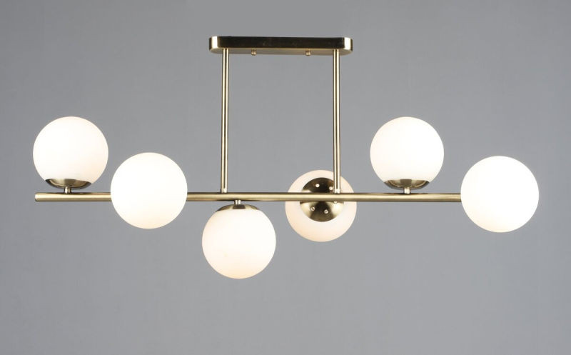 Конструкція люстри передбачає шість скляних плафонів, які рівномірно розподіляють світловий потік, забезпечуючи якісне освітлення навіть великих приміщень. Використання шести патронів типу E27 дозволяє варіювати потужність освітлення залежно від обраних ламп. Поєднання металу та скла гарантує довговічність та легкість у догляді.