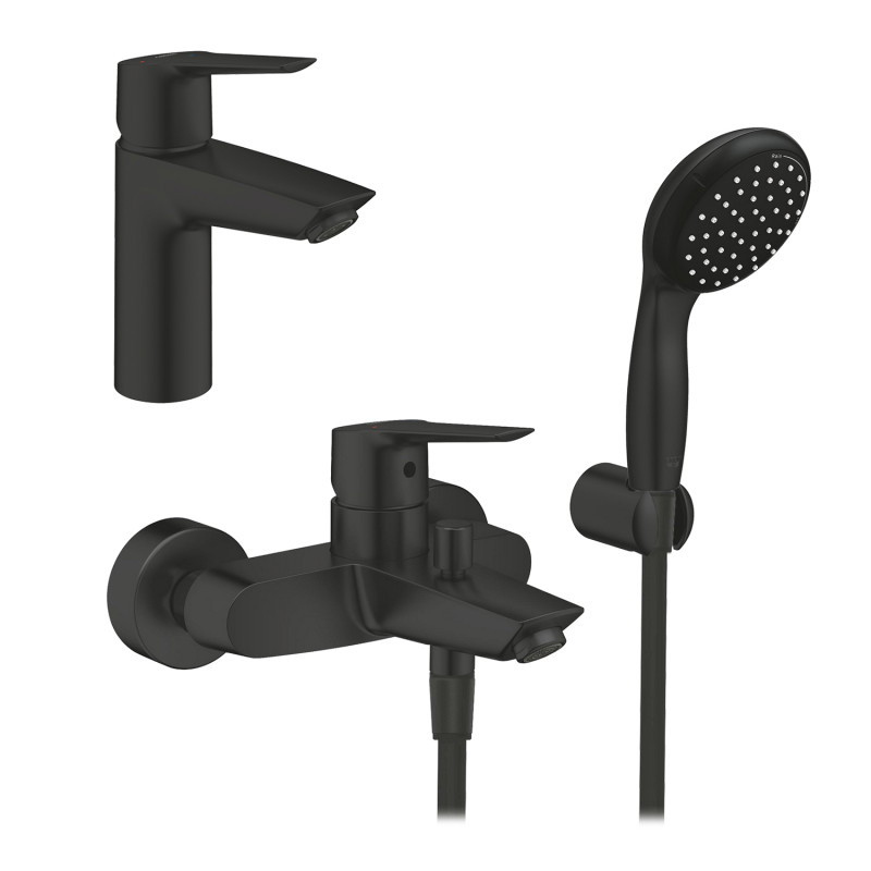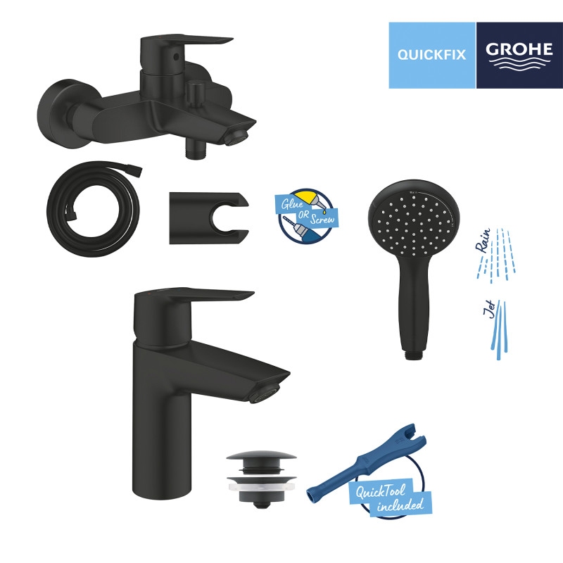 Набір змішувачів для ванної кімнати Grohe QuickFix Start ColdStart Black UA303301SQ чорного матового кольору складається із змішувача для раковини, змішувача для ванни та душового набору з настінним тримачем. Всі елементи виготовлені з високоякісних матеріалів і ідеально поєднуються між собою. Керамічні картриджі забезпечують тривалий термін роботи, що підтверджується 5-річною гарантією. Набір дійсно закриє питання змішувачів ванної кімнати на довгі роки за рахунок сучасного дизайну та новітніх технологій. Також змішувач для раковини обладнаний функцією холодного старту, що значно скорочує витрати гарячої води.