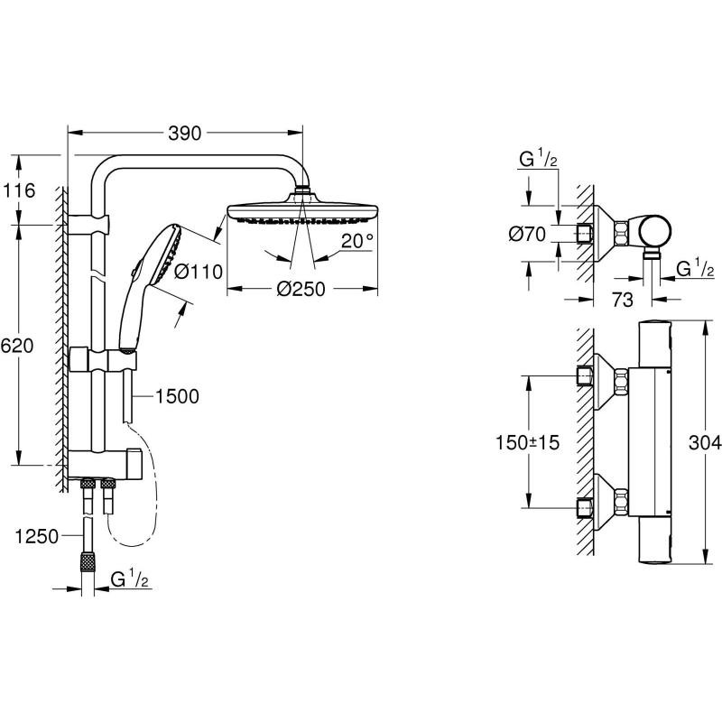 Душева система Vitalio Start 250 Flex у приголомшливому чорному матовому кольорі - це швидкий спосіб покращити якість прийому душу та естетику ванної кімнати. Виставлена система для настінного монтажу складається з лійки діаметром 250 мм, ручного душу діаметром 110 мм, дивертора для легкого перемикання між лійкою та ручним душем або між двома струменями лійки, душової рейки з 390-міліметровою душовою штангою та ковзним елементом для регулювання також шлангів діаметром 1500 мм та 1250 мм. Головний душ пропонує м'який, розслаблюючий дощовий струмінь або SmartRain, що забезпечує аналогічний рівень комфорту, але зі зменшеним потоком. Ручний душ оснащений протиударним силіконовим кільцем, що захищає його від падінь та ударів. Він має 2 режими розпилення: м'який Rain та потужний, спрямований Jet Spray. Обидва режими легко доступні за допомогою інноваційного дивертора GROHE SmartSwitch на задній панелі лійки. А обмежувач витрати GROHE Water Saving значно знижує витрати води без шкоди для продуктивності. Система GROHE DreamSpray гарантує, що потік із кожної форсунки буде оптимальним, роблячи прийняття душу максимально комфортним та приємним. Силіконові форсунки SpeedClean призначені для очищення від накипу простим протиранням. Міцне і легке покриття GROHE Long-Life зберігає бездоганний вигляд душової системи навіть після багатьох років використання. Гнучка установка та просте підключення через 1250-міліметровий шланг роблять цю систему сумісною із змішувачем у вашому існуючому душі, так що ви зможете швидко оновити її.