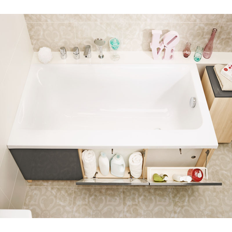 Меблева панель SMART 170 має білий фасад, який відповідає оснащенню та керамічним елементам у кожній сучасній ванній кімнаті. Ця модель складається з великого відділення для зберігання, прихованого під ванною плюс три шафи, оснащених системою PUSH. Всі полиці створюють зручне місце для зберігання косметики та повсякденного використання туалетно-косметичних засобів. Його міцність і безпека гарантується вологостійким корпусом.