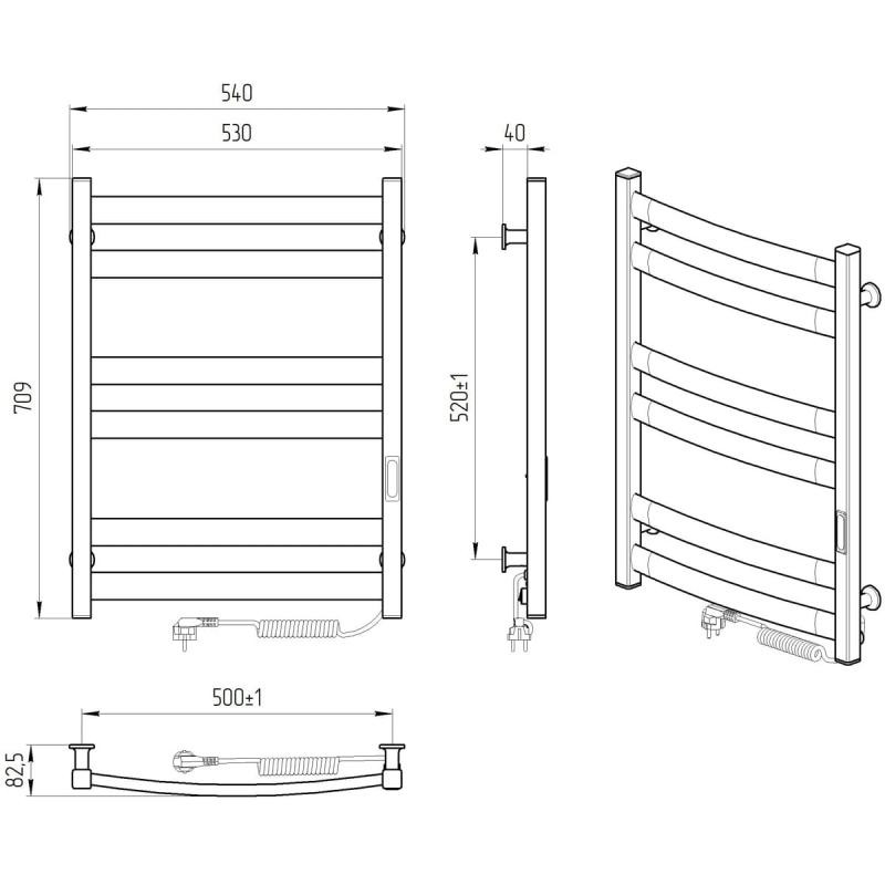 Рушникосушарка – 1 шт, кріплення (шуруп оцинкований з дюбелем, пластикове кріплення, різьбова втулка, штифт) - 4 шт, ключ шестигранний – 1 шт, упаковка (короб картонний, чохол поліетиленовий, чохол поліетиленовий для кріплення, коробочка для кріплень) – 1 шт, паспорт – 1 шт.