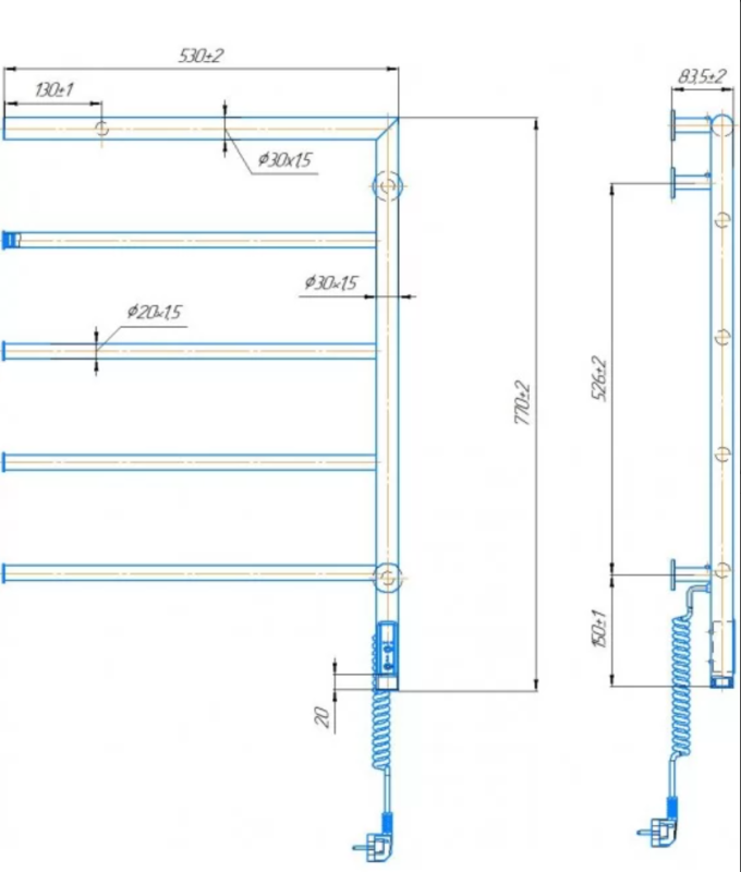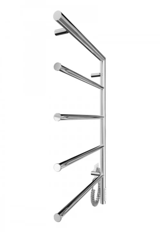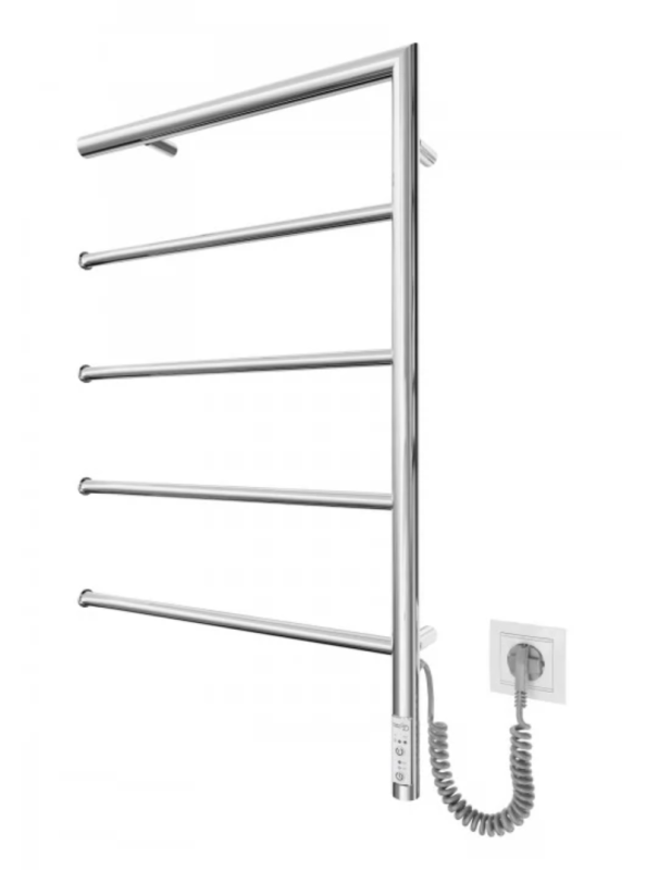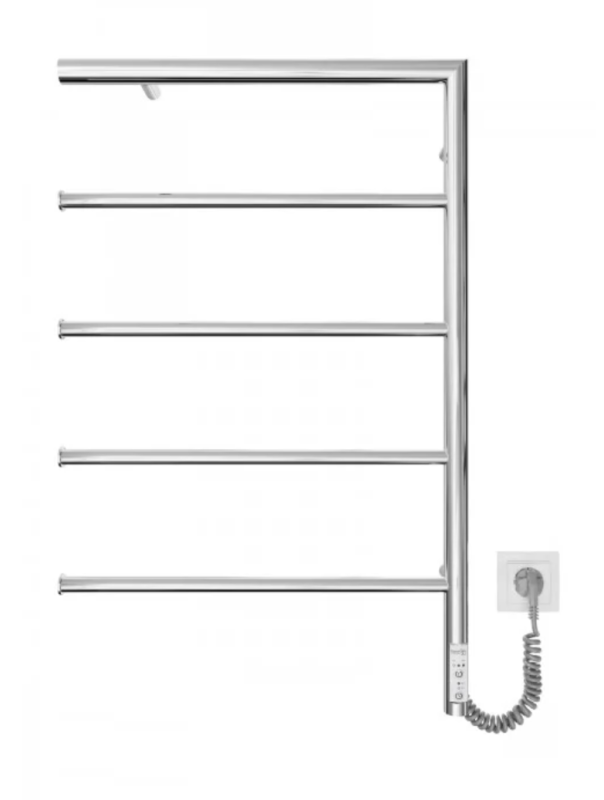 Оснащена таймер-регулятором та конектором для підключення до розетки з будь-якої сторони. Сумісна з комплектом прихованого підключення. Має 5 перекладин та стійки. Виготовлена ​​із полірованої нержавіючої сталі без хромування. Температурні режими таймер-регулятора: 40 ° С, 45 ° С, 50 ° С. Варіанти часу роботи: 3, 6 годин та постійне нагрівання. Потужність [3 Вт].