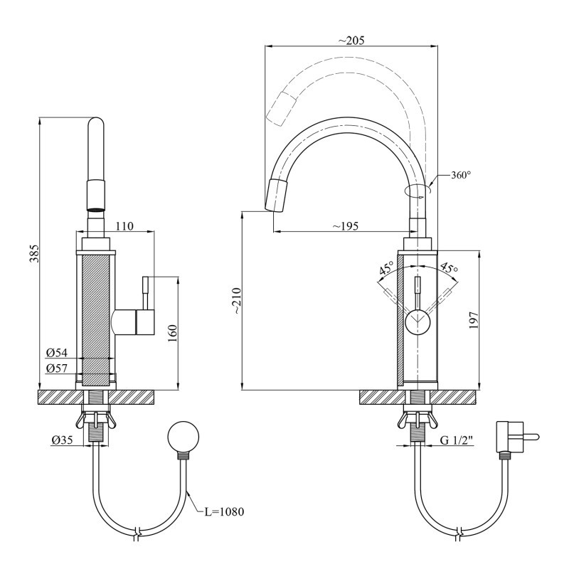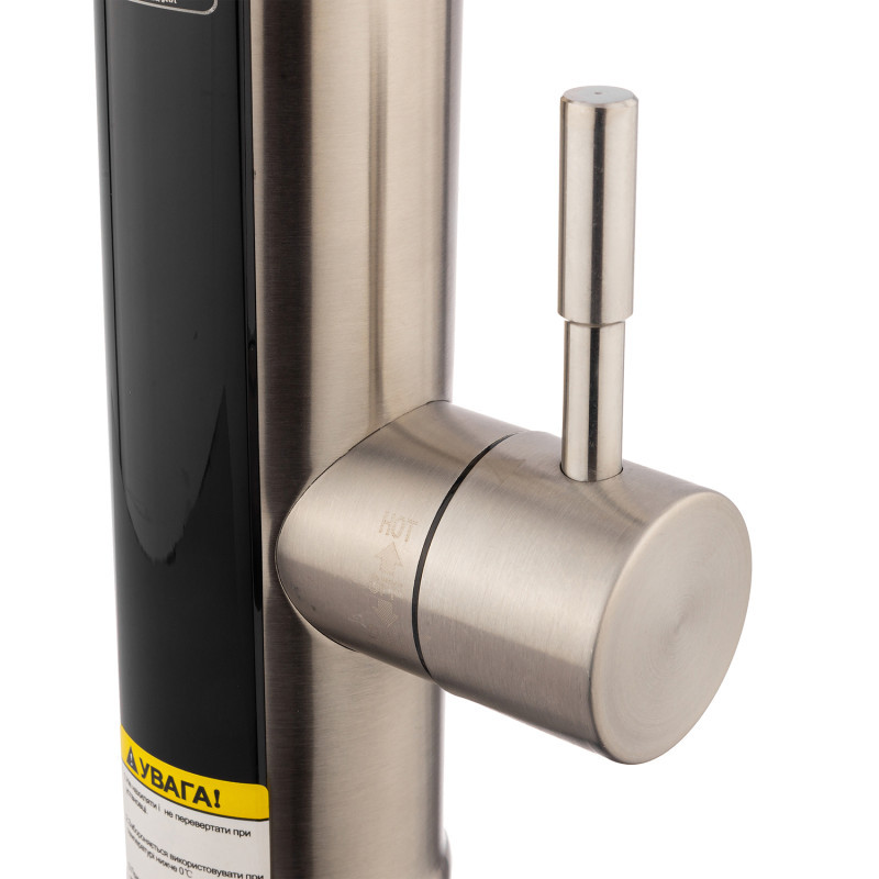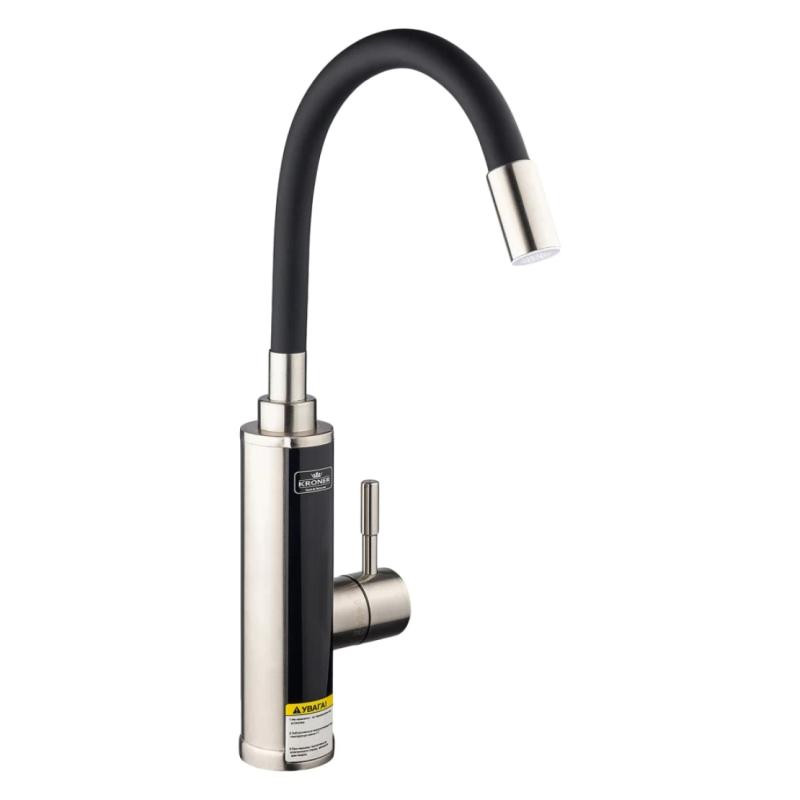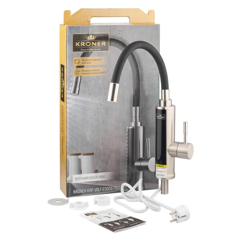 Кран для кухні та раковини з електронагрівом Kroner KRP Volt-ESG087RSS CV023251 виготовлений з латуні, нержавіючої сталі та ABS-пластику чорного кольору. Змішувач встановлюється на один отвір та підключається шлангом до холодної води (шланг купується окремо). Змішувач обладнаний поворотним виливом з аератором. Також на корпусі є екран, який відображає поточну температуру води. Цей кран стане ідеальним рішенням для дач, літніх будиночків або хостелів, де потрібна гаряча вода.