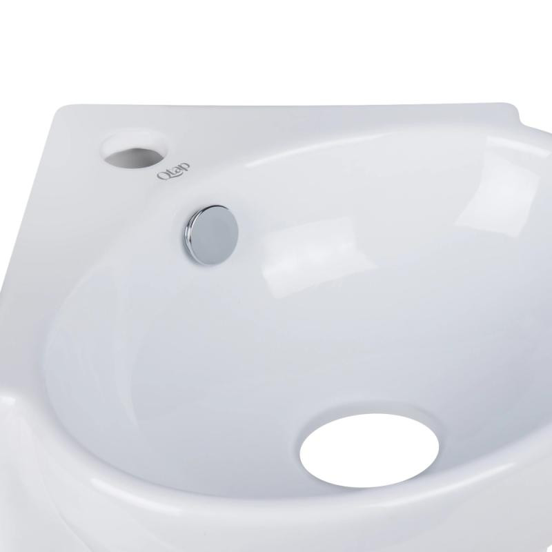 Раковина Qtap Leo QT11115010WN має ергономічну форму, виконана з якісної кераміки білого кольору з отворами для змішувача та переливу. Вона встановлюється на стіну в кут за допомогою кріплень, що входять до комплектації. На пристінні поверхні є можливість поставити аксесуари та приладдя. Сифон для раковини набувається окремо.