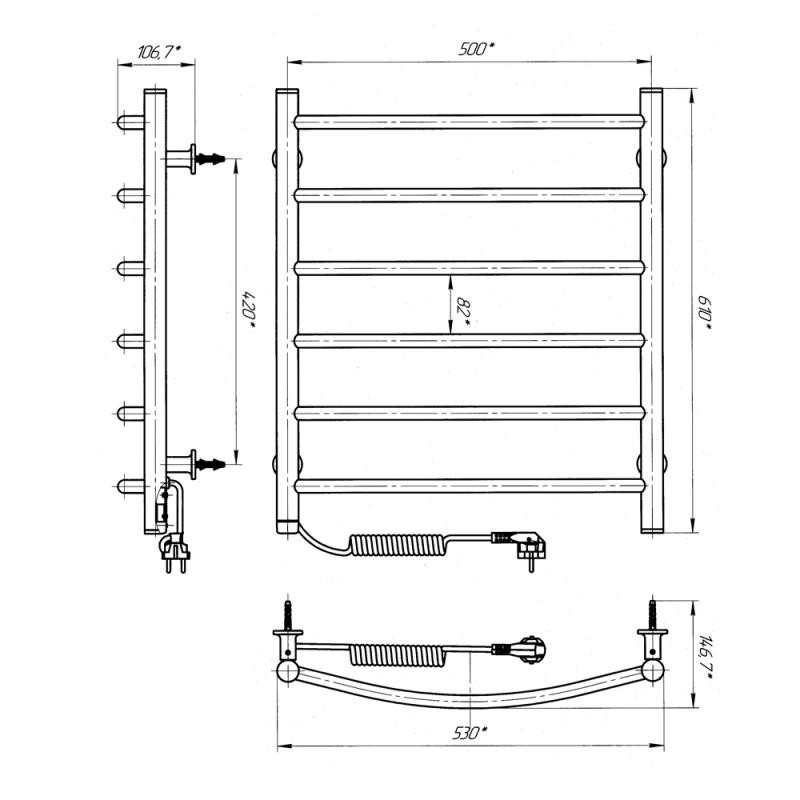 Рушникосушарка – 1 шт, кріплення (шуруп оцинкований з дюбелем, пластикове кріплення, різьбова втулка, штифт) - 4 шт, ключ шестигранний – 1 шт, упаковка (короб картонний, чохол поліетиленовий, чохол поліетиленовий для кріплення, коробочка для кріплень) – 1 шт, паспорт – 1 шт.