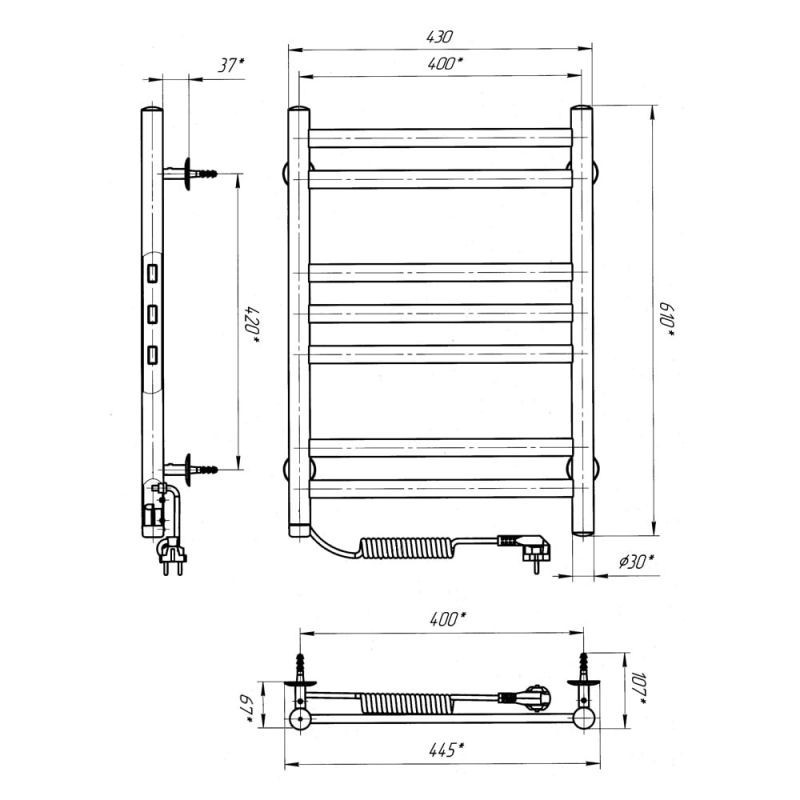 Рушникосушарка – 1 шт, кріплення (шуруп оцинкований з дюбелем, п'ятак, втулка, штифт, стійка) - 4 шт, ключ шестигранний – 1 шт, упаковка (короб картонний, чохол поліетиленовий, чохол поліетиленовий для кріплення, коробочка для кріплень) – 1 шт, паспорт – 1 шт.