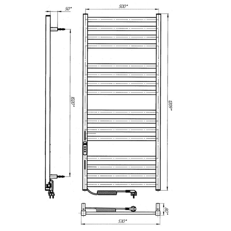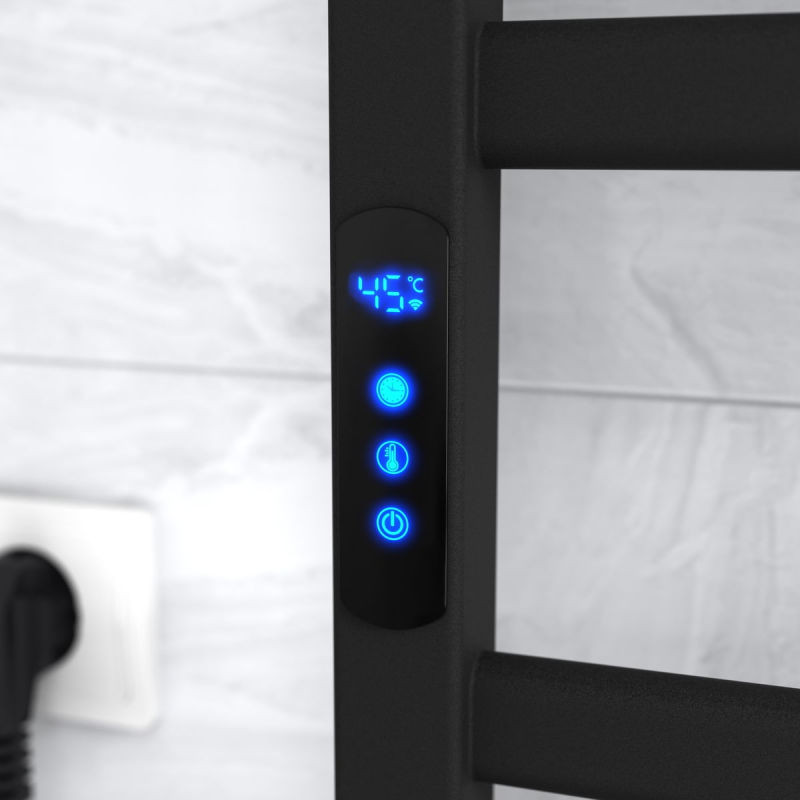 Особливості: керує нагріванням електрорушникосушки мікропроцесорний термоконтролер (сенсорне управління або через Wi-Fi). Для початку роботи необхідно включити сушарку для рушників і задати температуру роботи приладу в градусах від 30 до 55°С (з кроком 5°С). Термодатчик контролює температуру поверхні сушки для рушників, що виключає можливість його перегріву. Серед переваг регулятора – можливість керувати терморегулятором за допомогою Wi-Fi, наявність таймера відключення (1-12h) та пам'ять режиму роботи.