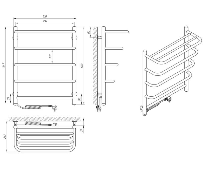 Рушникосушарка – 1 шт, кріплення (шуруп оцинкований з дюбелем, п'ятак, втулка, штифт, стійка) - 4 шт, ключ шестигранний – 1 шт, упаковка (короб картонний, чохол поліетиленовий, чохол поліетиленовий для кріплення, коробочка для кріплень) – 1 шт, паспорт – 1 шт.