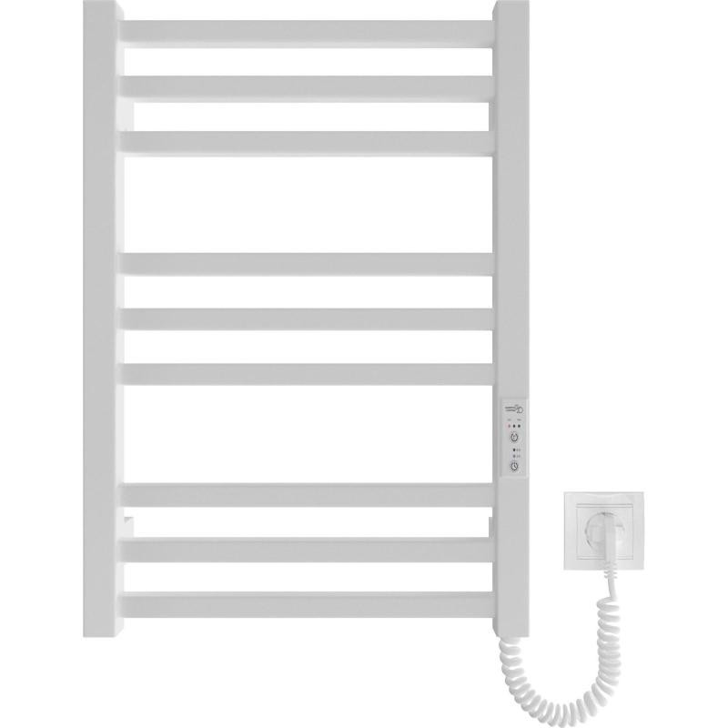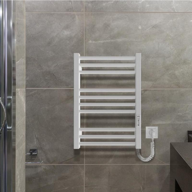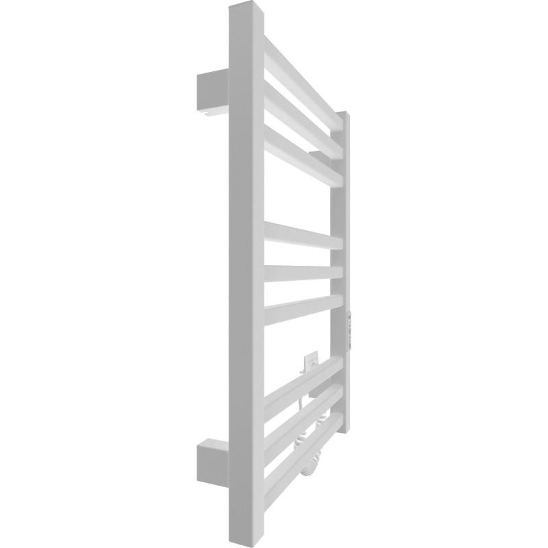 Електрична рушникосушарка HF Derby 570x430. Працює за технологією сухого ТЕНу. Обладнана вбудованим таймер-регулятором і конектором для підключення до живлення з будь-якого боку. Оснащена комплектом для прихованого підключення. Модель має 10 ребер з круглої труби та стійки з квадратного профілю. Матеріал - чорна сталь з антикорозійною обробкою. Варіанти покриття: чорний мат або білий мат. Температурні режими таймер-регулятора: 40°С, 45°С, 50°С. Час роботи: 3, 6 годин або постійний нагрів. Потужність 90 Вт. Гарантія - 3 роки.