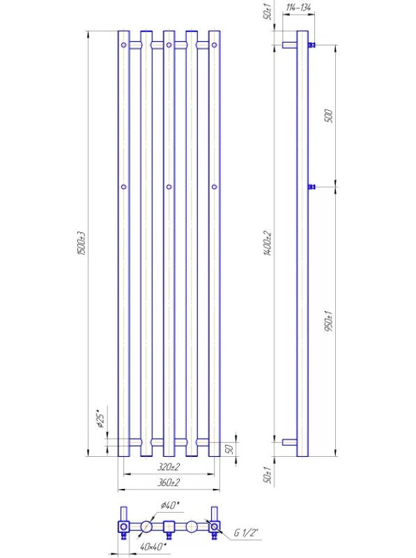 Сушка для рушників Маріо Бітуб 1500х360/320. Розміри: висота – 1490 мм, ширина – 360 мм, глибина 114 мм, міжцентрова відстань для підключення – 320 мм, діаметр підключення G1/2". Варіанти підключення: нижнє, діагональне. Кількість ребер – 5, в даній моделі використовується комбінація профільної та круглої труби.