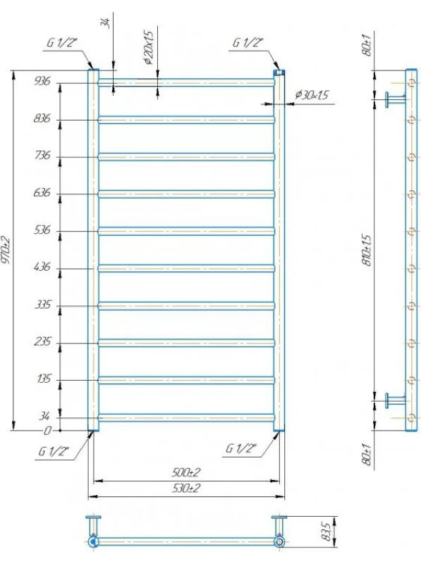 Сушка для рушників INOX Флет 970×530/500 виконана з полірованої нержавіючої сталі, яка демонструє високу стійкість до корозії. Розміри виробу: висота - 970 мм, ширина - 530 мм, глибина - 80 мм, міжосьова відстань підключення - 500 мм, діаметр G1/2''. Доступні три типи підключення: нижнє, бічне та діагональне. Конструкція має 10 нагрівальних ребер, що забезпечує потужну тепловіддачу. Для цілорічного використання водяну модель можна перетворити на комбіновану, встановивши ТЕН потужністю 300 Вт. Сумісні аксесуари - поворотні полиці та навісні гачки - дозволяють розширити функціонал. Рекомендується підключити через фірмові крани Mario. Гарантія: 50 років у закритій системі опалення та 5 років – у централізованій.
