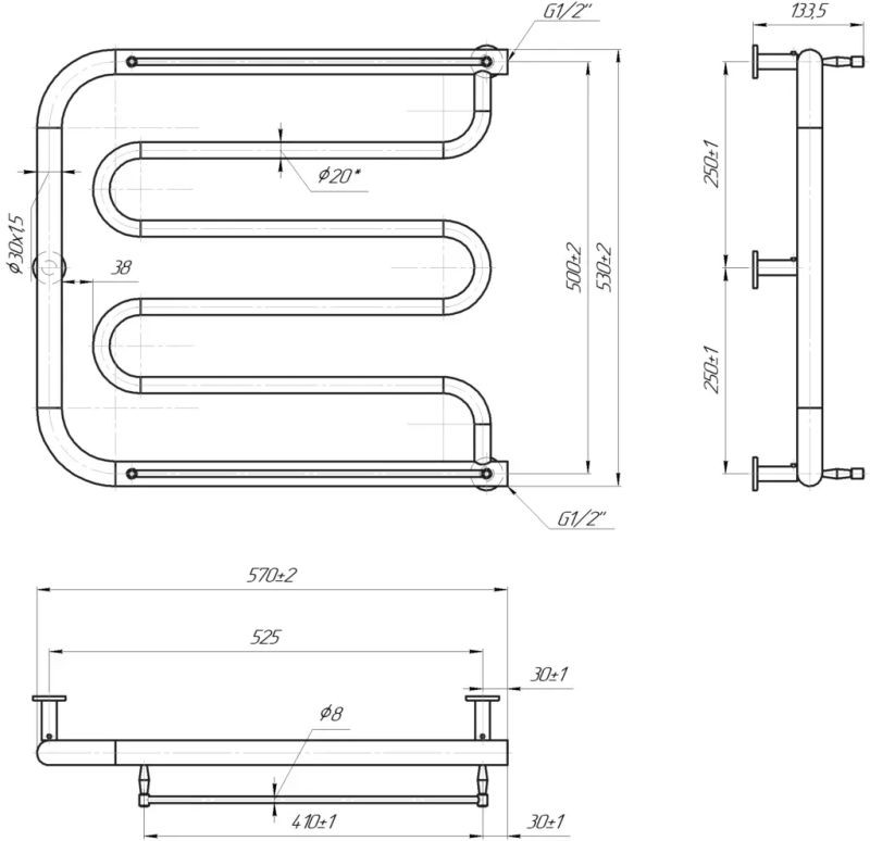 Габарити моделі: висота – 530 мм, ширина – 570 мм, глибина – 100 мм. Міжосьова відстань для підключення - 500 мм, стандартний діаметр - G1/2''. Оснащений 6 горизонтальними перемичками, вертикальні стійки виготовлені з круглої полірованої нержавіючої сталі без хромування.