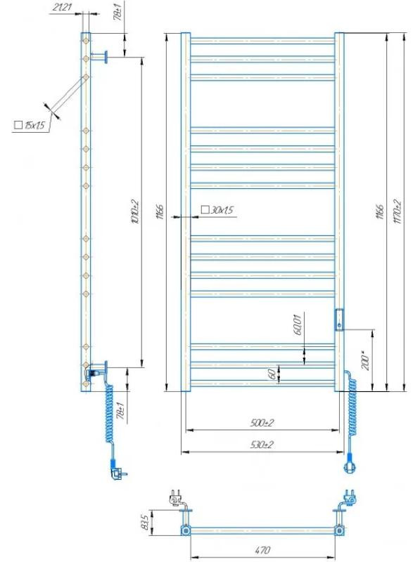 Конектор для підключення до розетки з будь-якої сторони. Набір прихованого підключення. Має 14 ребер та стояк з профільної труби. Виготовлений із полірованої нержавіючої сталі без хромування. Потужність 150 Вт. Додатково для зручності використання можна оснастити гачками. Гарантія – 20 років на корпус/5 років на електричну частину.
