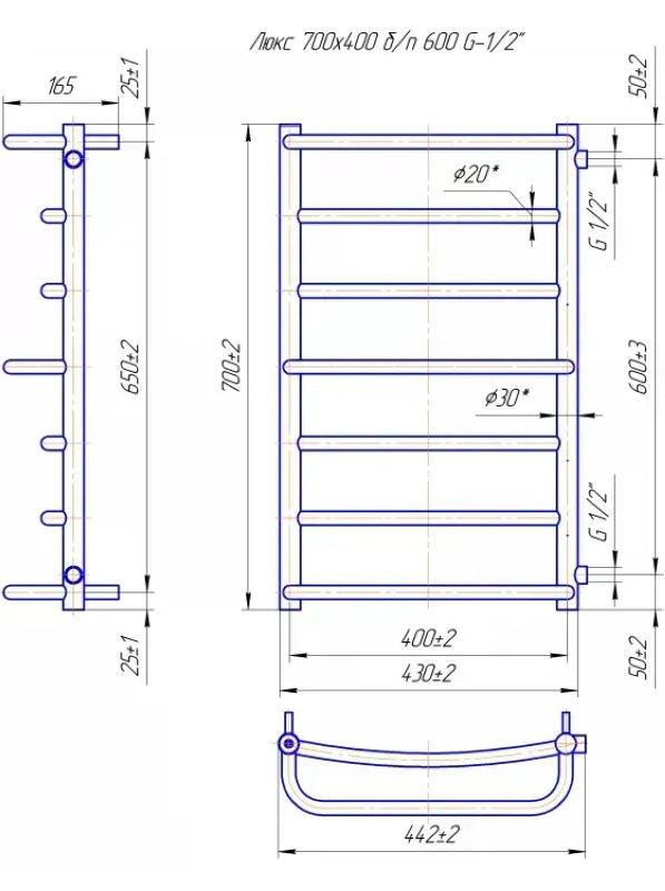 Водяна рушникосушарка Люкс Б/П 1/2" 700х450 з міжцентровою відстанню для підключення 600 мм, діаметр підключення G 1/2'' складається з 7 ребер. Рушникосушарка Люкс Б/П 1/2" з боковим підключенням заводу виробника Mario виготовлена з нержавіючої сталі АІSI 304. Є можливість ⟳перевернуть на 180° дзеркально відобразивши.