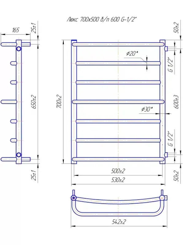 Водяна рушникосушарка Люкс Б/П 1/2" 700х550 з міжцентровою відстанню для підключення 600 мм, діаметр підключення G 1/2'' складається з 7 ребер. Рушникосушарка Люкс Б/П 1/2" з боковим підключенням заводу виробника Mario виготовлена з нержавіючої сталі АІSI 304. Є можливість ⟳перевернуть на 180° дзеркально відобразивши.