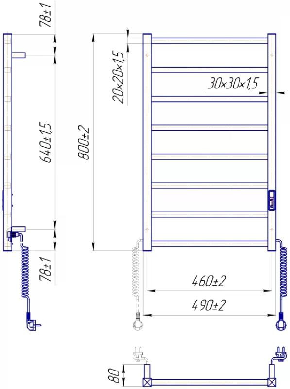 Електросушарка для рушників побутова Токіо-I 800х500/80 TR К. Обладнана таймер-регулятором та конектором для підключення в розетку з будь-якого боку. Сумісна з комплектом прихованого підключення. Має 8 ребер та стояки з квадратного профілю. Виготовлена з полірованої нержавіючої сталі без хромування. Варіанти покриття: полірована або сатин, чорний мат, білий глянець, золото, бронза. Температурні режими таймер-регулятора: 40°С, 45°С, 50°С. Варіанти часу роботи: 3, 6 годин та постійний нагрів. Потужність 120 Вт. Додатково для зручності користування можна оснастити навісними гачками. Гарантія - 20 років на корпус / 5 років на електричну частину.