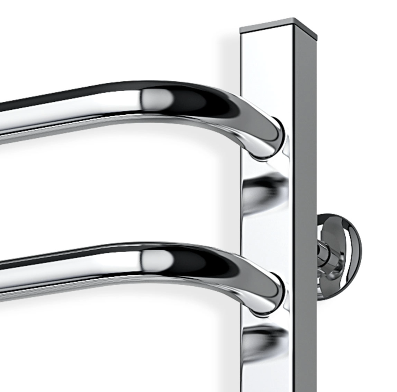Електрична сушарка для рушників NAVIN Грандіс. Модель має бічні колектори (стійки), виконані з профільної квадратної труби 30х30 мм, а перемички — з круглих трубок 20х20 мм. Це створює просту, строгу й доконечно привабливу геометричну гармонію.