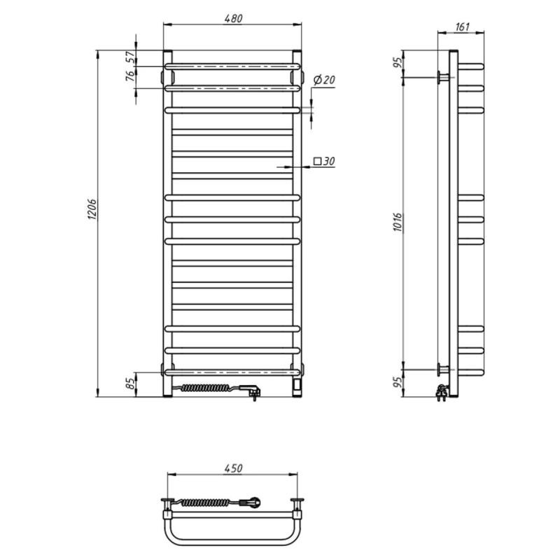 Електрична сушарка для рушників NAVIN Грандіс. Модель має бічні колектори (стійки), виконані з профільної квадратної труби 30х30 мм, а перемички — з круглих трубок 20х20 мм. Це створює просту, строгу й доконечно привабливу геометричну гармонію.