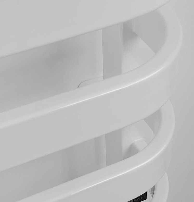 Електрична рушникосушка Navin Stugna, колектори якої виконані з профільної квадратної труби 30х30 мм, а перемички з прямокутних вигнутих трубок 30х10мм. Вигнуті та винесені на 8 см вперед прямокутні перемички підвищують конвекційну дію, що підвищує функціональність рушникосушарки Navin Stugna.
