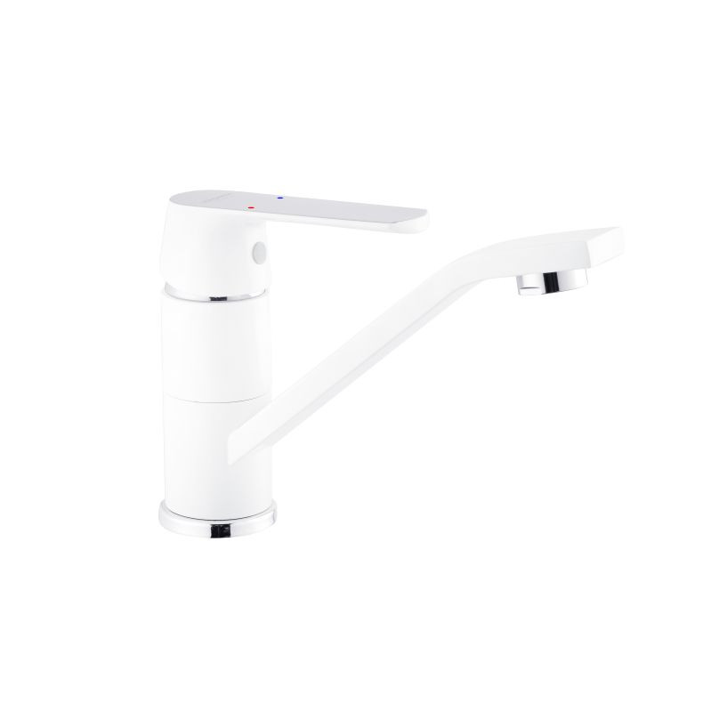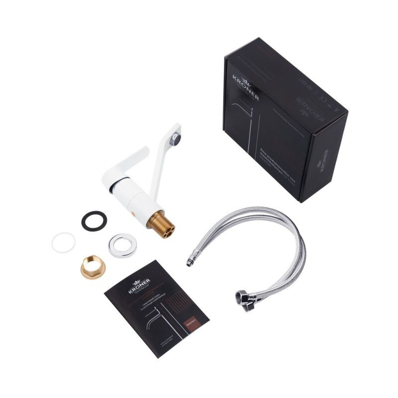 Змішувач для умивальника Kroner KRP Armada-W011 CV024324 виконаний з латуні та має гладку білу поверхню. Наявність аератора гарантує рівний струмінь без бризок. Керамічний картридж 35 мм забезпечує плавний хід важеля довгі роки. Поворотний вилив змішувача має плоску форму з оригінальним козирком на краю. Такий тип змішувача зручно використовувати із великими раковинами.