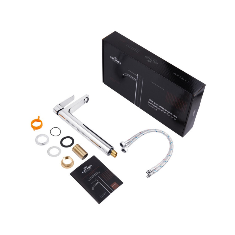 Змішувач для раковини-чаші Kroner KRP Eifel-C010-3 CV023604 із хромованою поверхнею встановлюється на стільницю на 1 отвір. Підключається за допомогою гнучких шлангів, що входять до комплекту постачання. Керамічний картридж діаметром 30 мм забезпечує точне налаштування температури та напору води. Змішувач легко встановлюється як новий ремонт, так і замість старого.