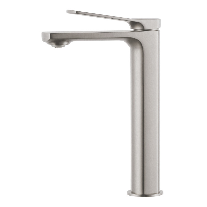 Високий змішувач для раковини Volle Solo 1510.011302 із оригінальним кольором покриття - шліфований нікель, виготовлений із високоякісної латуні. Одноважільна конструкція змішувача оснащена керамічним картриджем, який дозволяє контролювати температуру та напір води. Для формування потужного та рівного струменя передбачений аератор, який змішує воду з повітрям і перешкоджає розбризкуванню. Висота та винос виливу дозволяють комбінувати змішувач з раковинами у формі чаш різної висоти та форми. Сам змішувач встановлюється на один отвір на стільницю і підключається за допомогою гнучких шлангів, що входять до комплекту постачання.