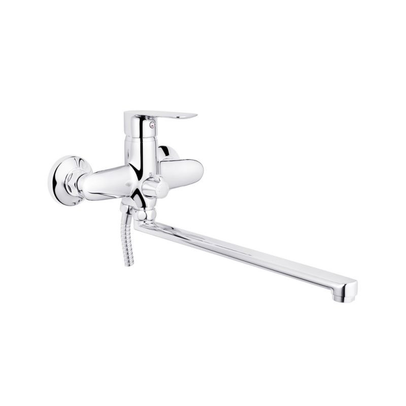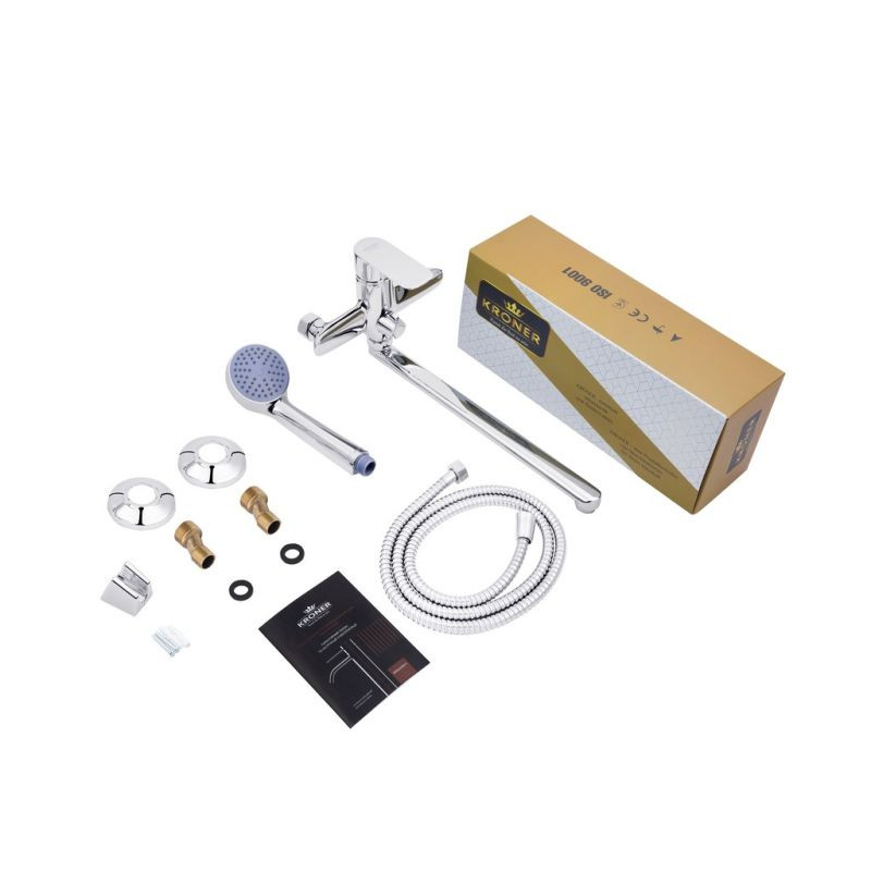 Змішувач для ванни з душовим набором Kroner KRM Main-C070 CV018620 оснащений керамічним картриджем діаметром 35 мм, що забезпечує довговічне якісне функціонування. Довгий поворотний вилив доповнений аератором, який змішує воду з повітрям і тим самим формує чудовий потік води без розбризкування. Сам змішувач виготовлений із силуміну та має гладке хромоване покриття, яке легко миється. Душовий комплект, що поставляється разом із змішувачем, складається з: ручного душу діаметром 80 мм, душового шланга довжиною 150 см і настінного тримача.