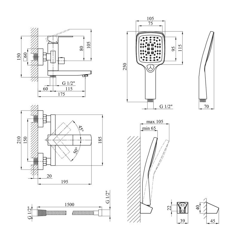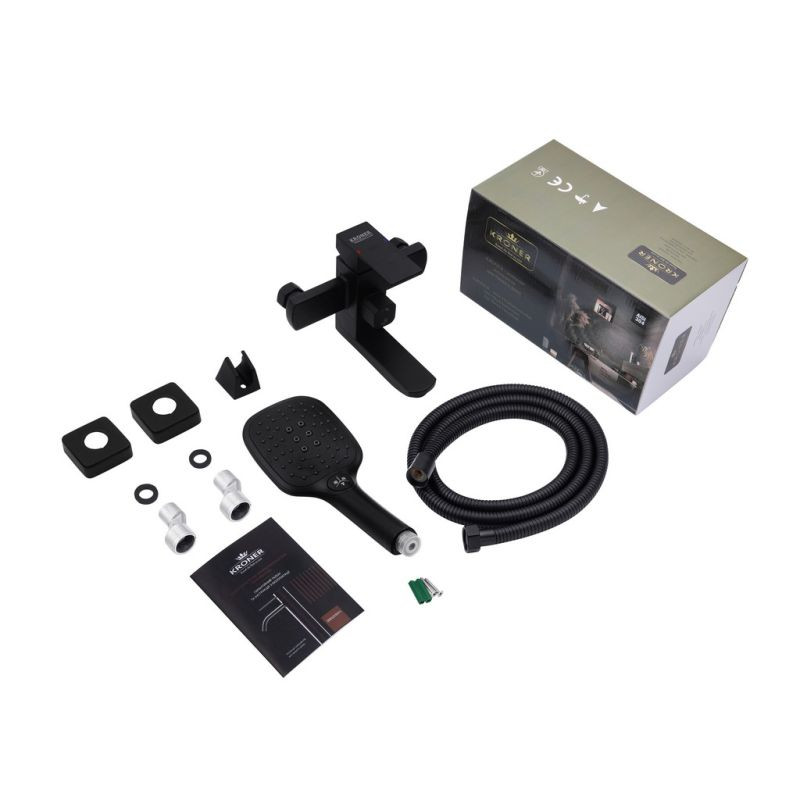Змішувач для ванни з душовим набором Kroner KRP Edelstahl Kubus-SCH060 CV025652 з чорним матовим покриттям виготовлений із високоякісної нержавіючої сталі. Даний матеріал служитиме довгі роки без ризику піддатися корозії або іншим впливам води. У комплекті до змішувача йде душовий набір з ручним душем із прямокутною великою душовою поверхнею, шлангом у металевому обплетенні та настінним тримачем. Вилив змішувача поворотний і його легко можна відсунути до стіни при прийнятті душу.