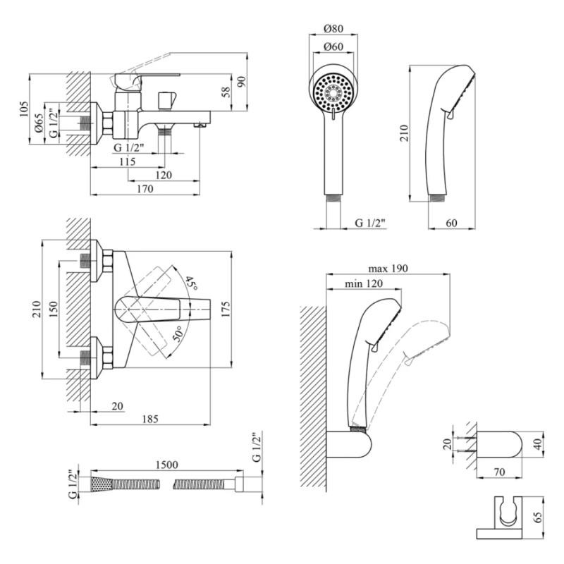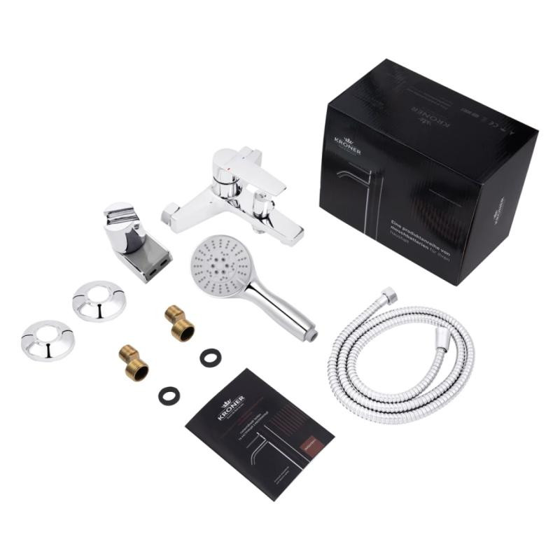 Смеситель для ванны с душевым набором Kroner KRP Eifel-C060 CV023607 изготовлен из латуни и имеет глянцевое хромированное покрытие. Душевой набор также выполнен в хромированном цвете и состоит из: лейки ручного душа с тремя типами струи, душевого шланга и настенного держателя ручного душа. Таким образом вы получаете полноценный, многофункциональный смеситель для ванны, который можно устанавливать как в новое помещение, так и использовать как замену старой модели.