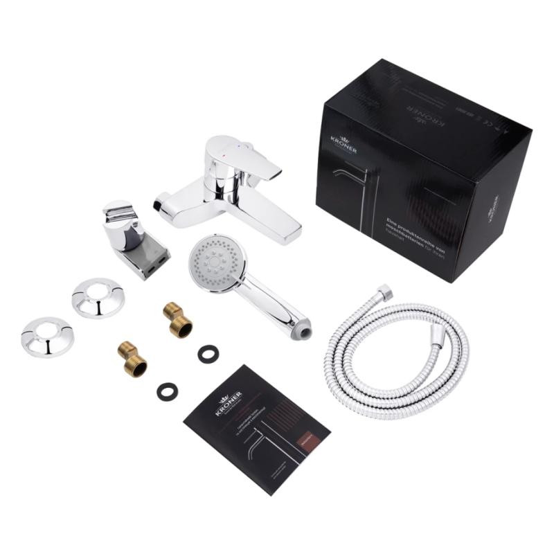 Змішувач для ванни з душовим набором Kroner KRP Enzo-C060 CV023606 виготовлений з латуні та має глянсове хромоване покриття. Змішувач доповнений душовим набором, який складається з: ручного душу з трьома типами струменя, шланга та настінного утримувача. Такий універсальний комплект буде чудовим придбанням для будь-якої сучасної ванної кімнати.