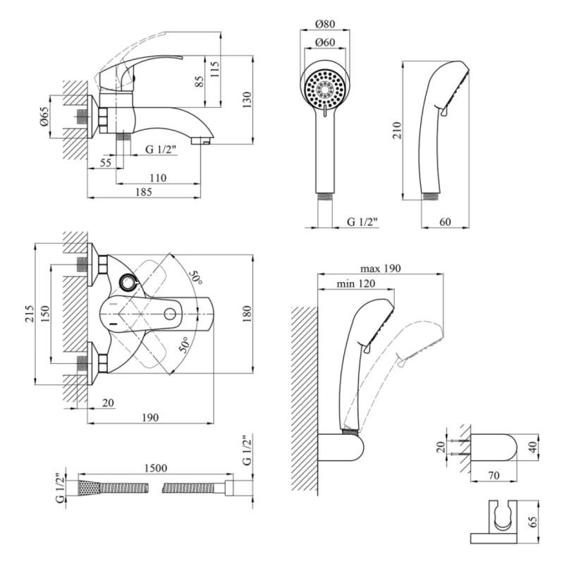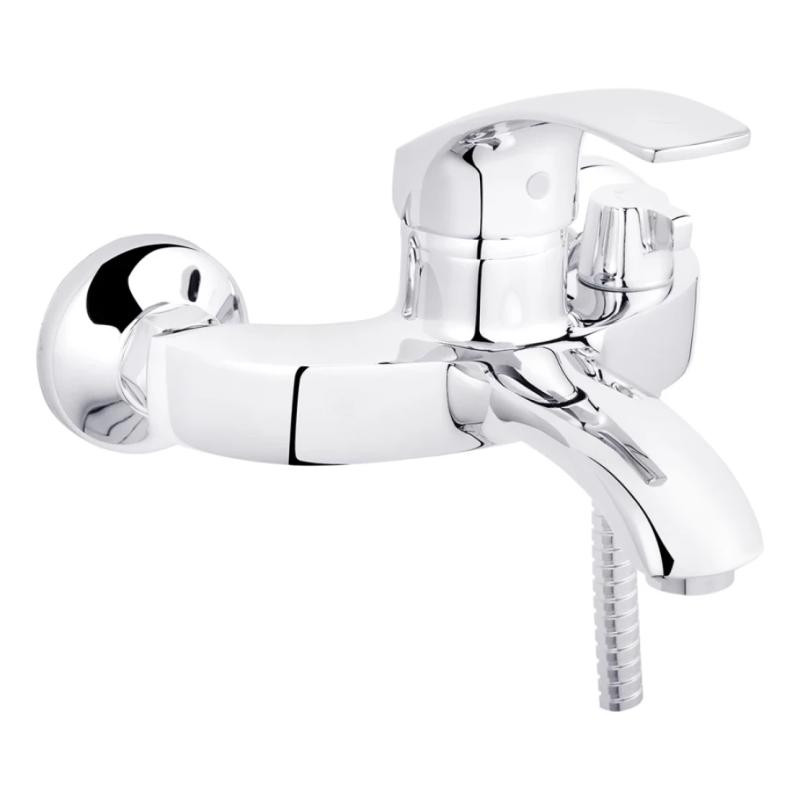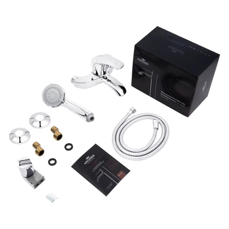 Змішувач для ванни з душовим набором Kroner KRP Konstante-C060 CV023589 виготовлений з латуні високої якості та має гладке хромоване покриття. Вилив на ванну видає прекрасний потік води, який формується аератором. У комплекті зі змішувачем йде душовий набір до складу якого входить: ручний душ із трьома типами струменя, душовий шланг та настінний тримач. Перемикач-дивертор розташований на корпусі змішувача.