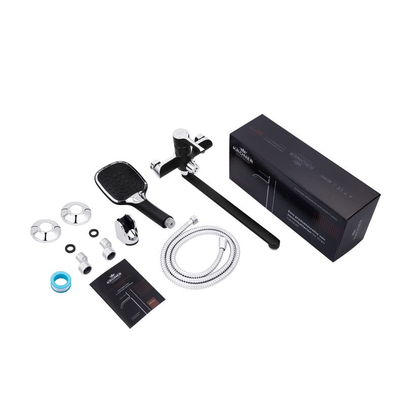 Змішувач для ванни з душовим набором Kroner KRP Essen-SCH070 CV024330 виконаний з латуні і має гладку чорну поверхню з хромованими елементами, яку легко доглядати. Довгий поворотний вилив зручно використовувати для ванни та раковини одночасно у компактних ванних кімнатах. Змішувач має стандартне підключення, завдяки чому його можна встановлювати як у новому приміщенні, так і при заміні старого змішувача. Перемикач із ванни на душ знаходиться прямо на корпусі змішувача. У комплекті зі змішувачем йде душовий набір із лійкою, шлангом та настінним тримачем.