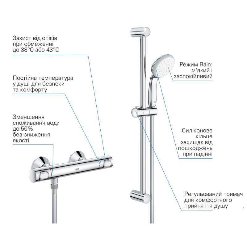 Термостатичний картридж GROHE забезпечує постійну подачу води ідеальної температури без неприємних коливань. Це також зручно для сім’ї де є діти, оскільки кнопка GROHE SafeStop встановлена на 38°C запобігає випадковому підвищенню температури води. Додатковий обмежувач температури GROHE SafeStop Plus можна налаштувати на обмеження до 43°C для додаткового рівня безпеки. А в разі повного збою подачі холодної води автоматичне захисне відключення зменшує витрату води до мінімуму. GROHE EcoJoy зменшує споживання води та енергії, а коли вам потрібна повна потужність, просто натисніть кнопку EcoButton, щоб відпустити ручку.