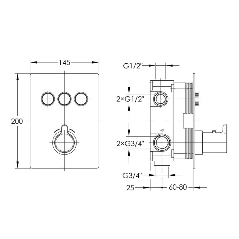 Змішувач прихованого монтажу термостатичний картридж Vernet із запобіжником на 38°C латунний кнопковий механізм Smart Click на 3 споживача додатковий вихід на запірний кран з кнопковим перемиканням та можливістю регулювання напору можливість одночасної роботи кількох функцій захист від зворотного потоку матеріал- латунь монтажний бокс з рівнем частина в комплекті прямокутна форма декоративної накладки 120х180 мм загальна витрата води - до 45 л/хв рекомендований тиск води: 1-5 бар розміри під'єднань G1/2" поверхня чорна матова