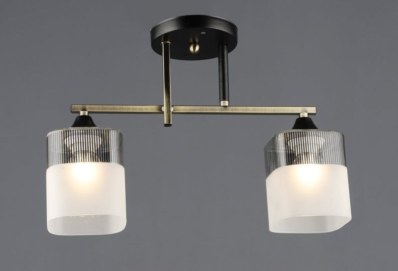Стельова люстра VALESO A4425/2 — це ідеальний вибір для створення акцентного або основного освітлення у вітальні, передпокої чи спальні. Дизайн світильника виконано у стилі, що поєднує класичну елегантність та сучасні лінії, завдяки контрастному поєднанню кольорів: благородної бронзи та насиченого чорного. Люстра виготовлена з якісної сталі та доповнена витонченими скляними плафонами.