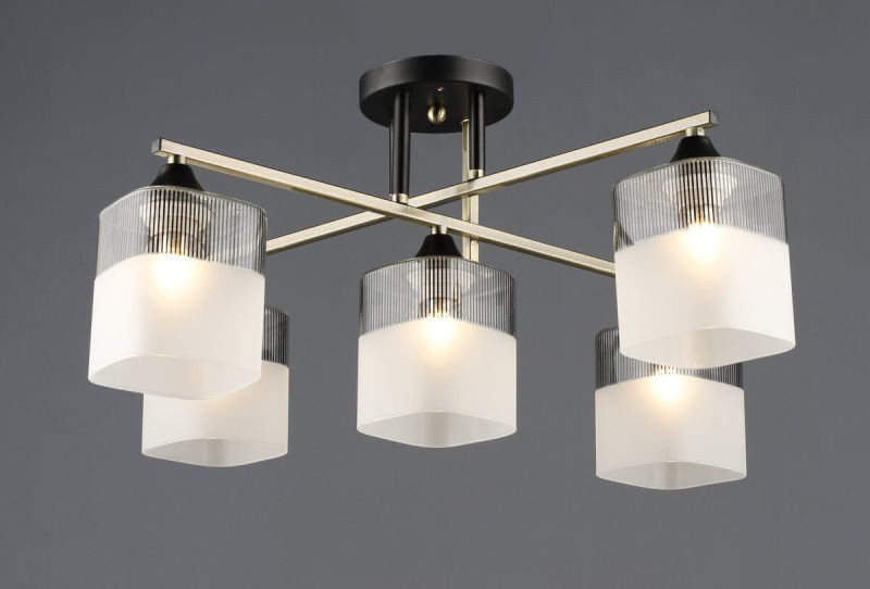 Елегантна стельова люстра VALESO A4425/5 стане центральним елементом освітлення у вашій вітальні, спальні або просторій кухні. Дизайн світильника поєднує класичний стиль з сучасними тенденціями, завдяки ефектному контрасту кольорів: благородної бронзи та глибокого чорного. Люстра виготовлена з високоякісної сталі та оснащена п'ятьма витонченими скляними плафонами, які забезпечують м'яке та розсіяне світло.