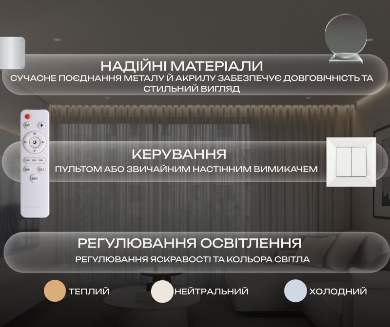 Завдяки вбудованим LED-технологіям потужністю 66W, люстра генерує потужний світловий потік у 5280 люменів, що ідеально підходить для ефективного освітлення просторих кімнат. Ключовою особливістю є можливість регулювання колірної температури від теплого 3000K до холодного 6500K, дозволяючи легко адаптувати атмосферу під різні потреби — від затишної до робочої. Усі налаштування, включаючи регулювання яскравості (димування), здійснюються за допомогою зручного інфрачервоного пульта дистанційного керування (IR With Dimming).
