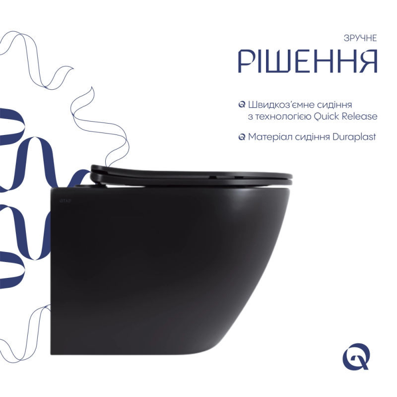Підвісний унітаз Qtap Robin New Ultra Quiet QT13332381АSMB у матовому чорному кольорі поєднує в собі сучасний дизайн, функціональність та зручність. Компактні розміри ідеально підходять для будь-якого простору, а сидіння Slim з дюропласту з функціями безшумного закривання та швидкого зняття забезпечує комфорт та простоту догляду. Технологія Ultra Quiet гарантує тихий змив, створюючи додаткову зручність у використанні. Стильний зовнішній вигляд, довговічні матеріали та продумані деталі роблять цей унітаз ідеальним вибором для сучасних інтер'єрів.