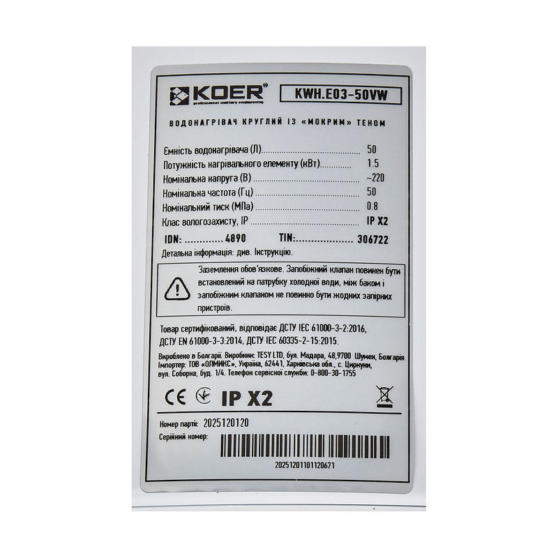 Опис Водонагрівач "Циліндр" Koer KWH.E03-50VW 50 л, мокрий тен 1,5 kW (EK0107)