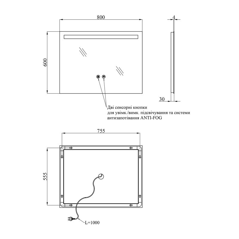 Управління здійснюється двома сенсорними кнопками на передній частині дзеркала.