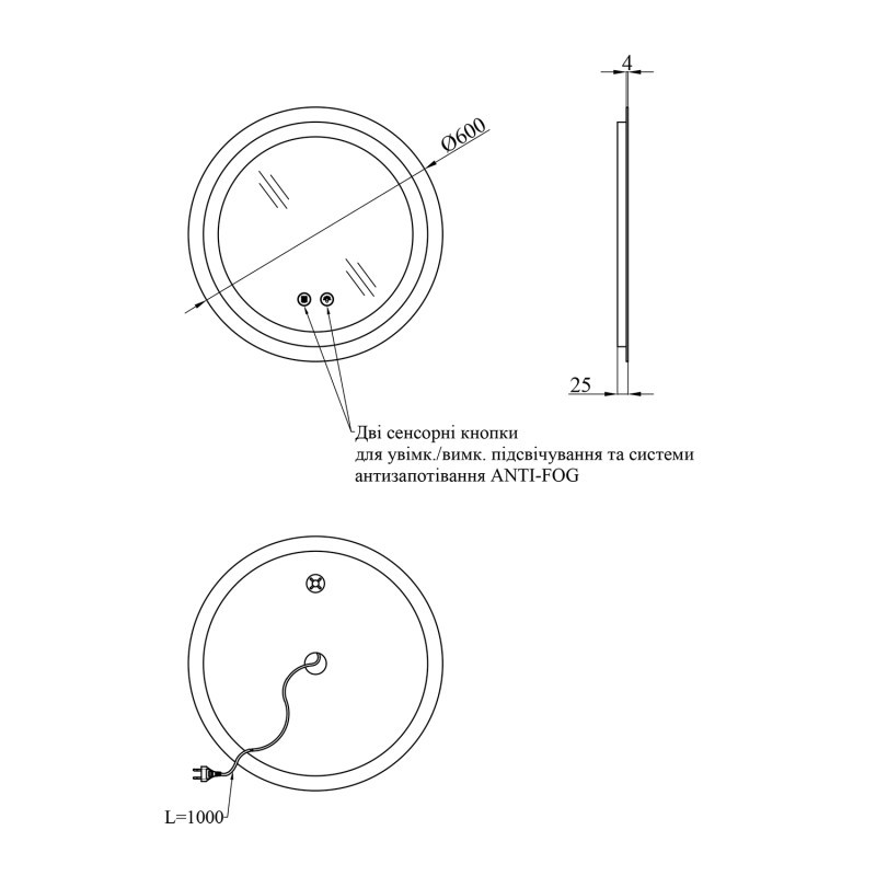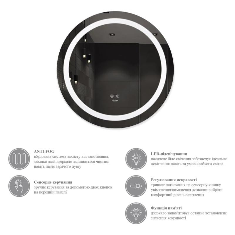 Управління здійснюється двома сенсорними кнопками на передній частині дзеркала.