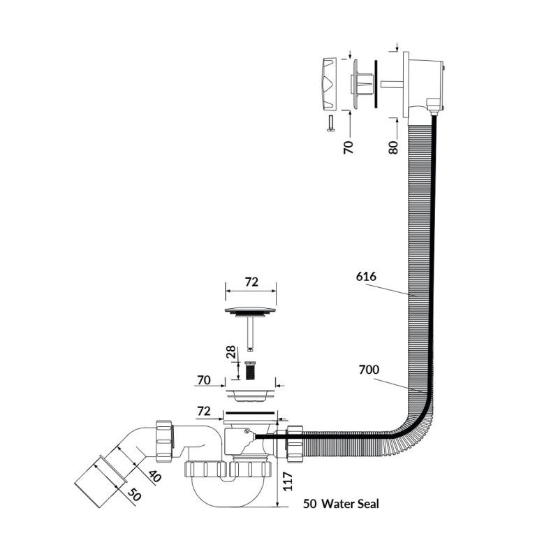 - автоматичний сифон з подовженою водовідвідною трубкою 70 см - призначений для вбудованих ванн з центральним зливом, наявних в портфоліо Cersanit: LARGA 180х80, 190х90 VIRGO 190х90.